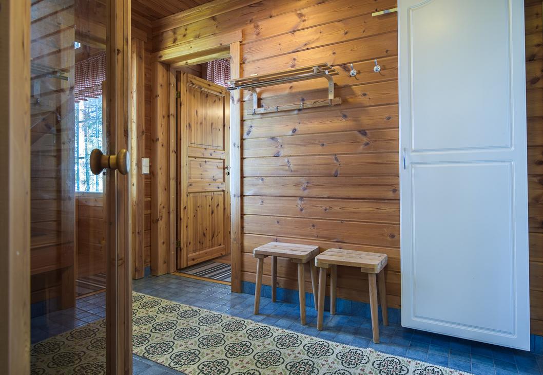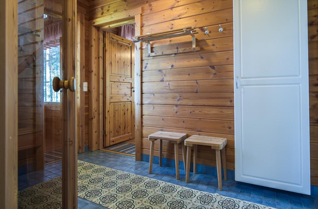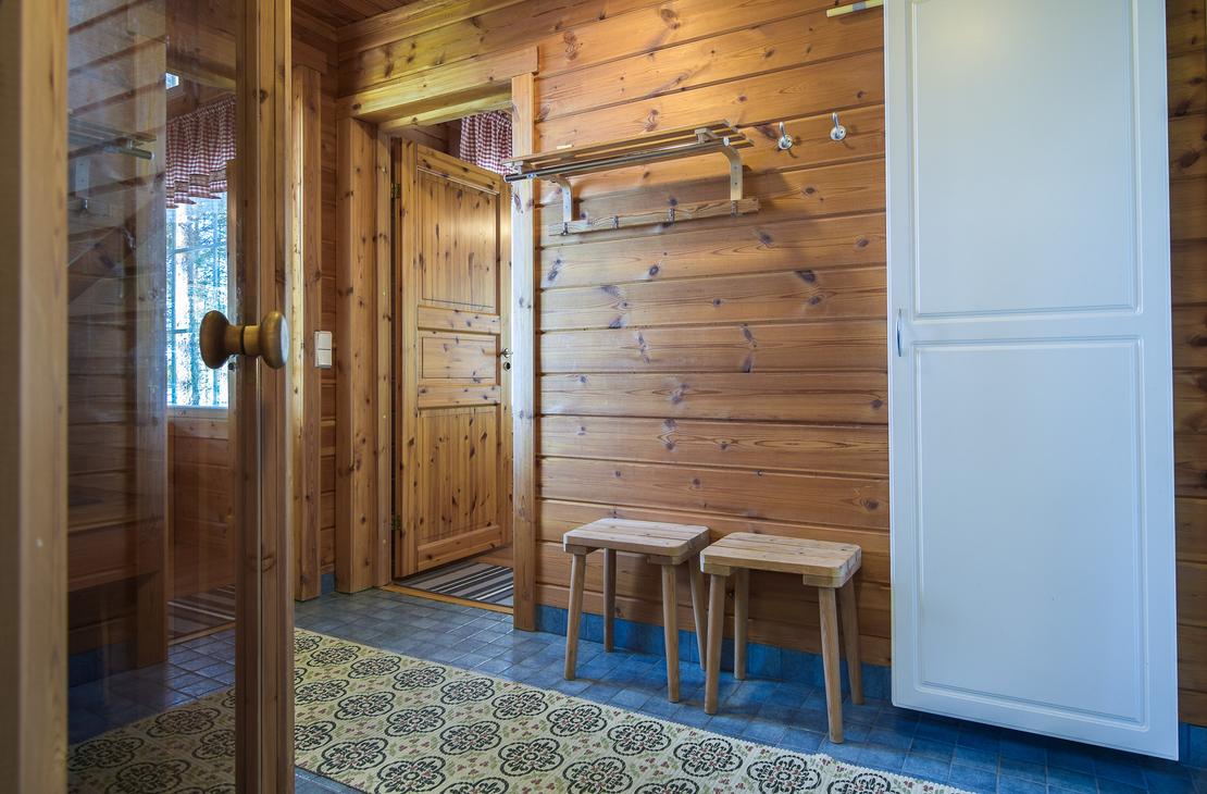 Mökissä on sähkösauna,josta pääsee ulos kuistille vilvoittelemaan taikkapa pulahtamaan kirkasvetiseen Pieliseen.