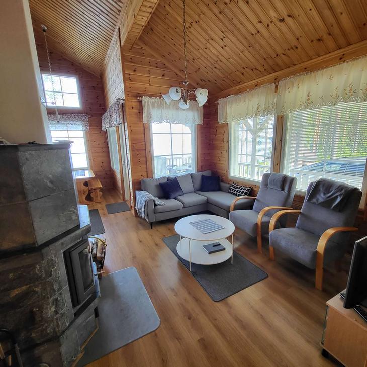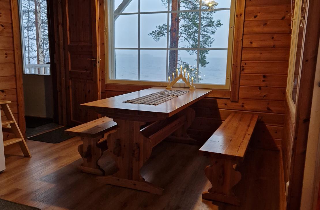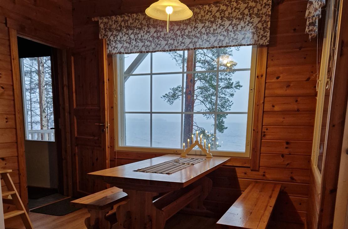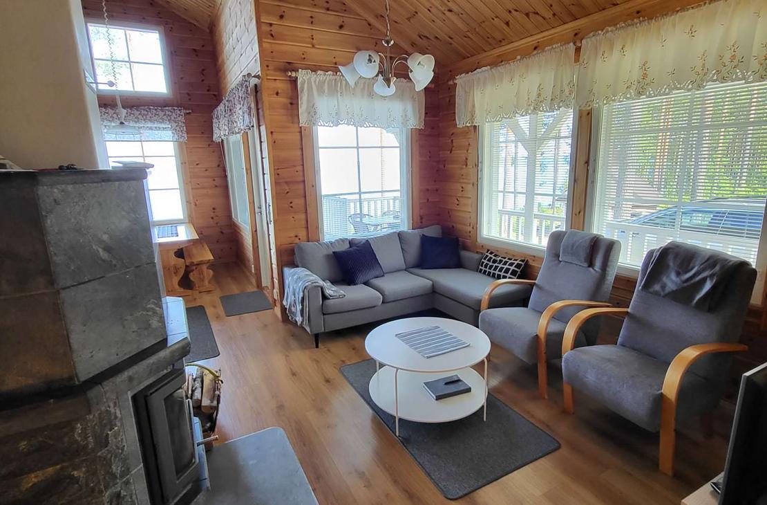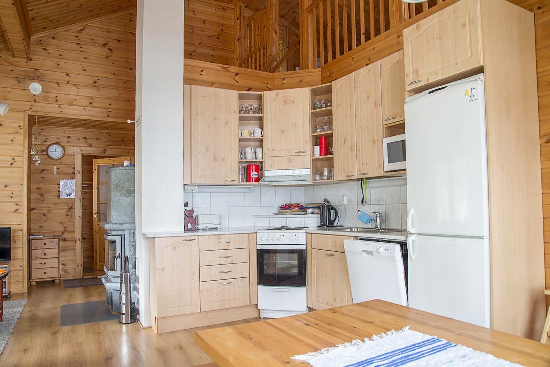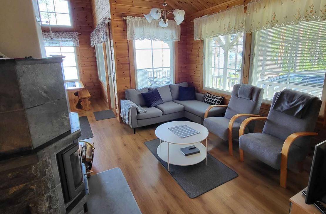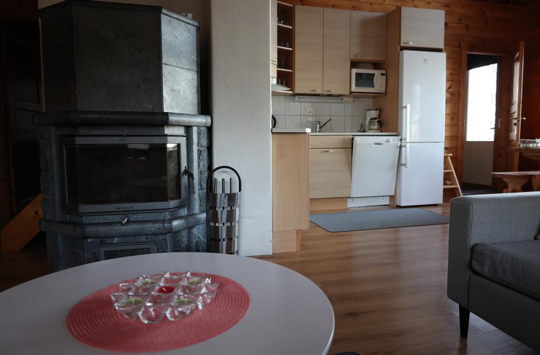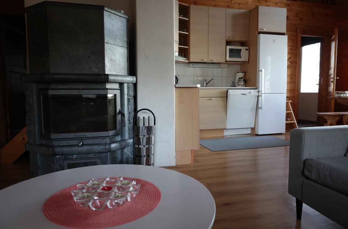 Olohuoneessa varaavatakka antamassa ihanasti tunnelmaa rentouttavaan lomanviettoon. Nykyaikaisessa keittiössä valmistat maistuvat ruuat ja voit nauttia aterioidessasi isosta ikkunasta avautuvaa järvimaisemaa.