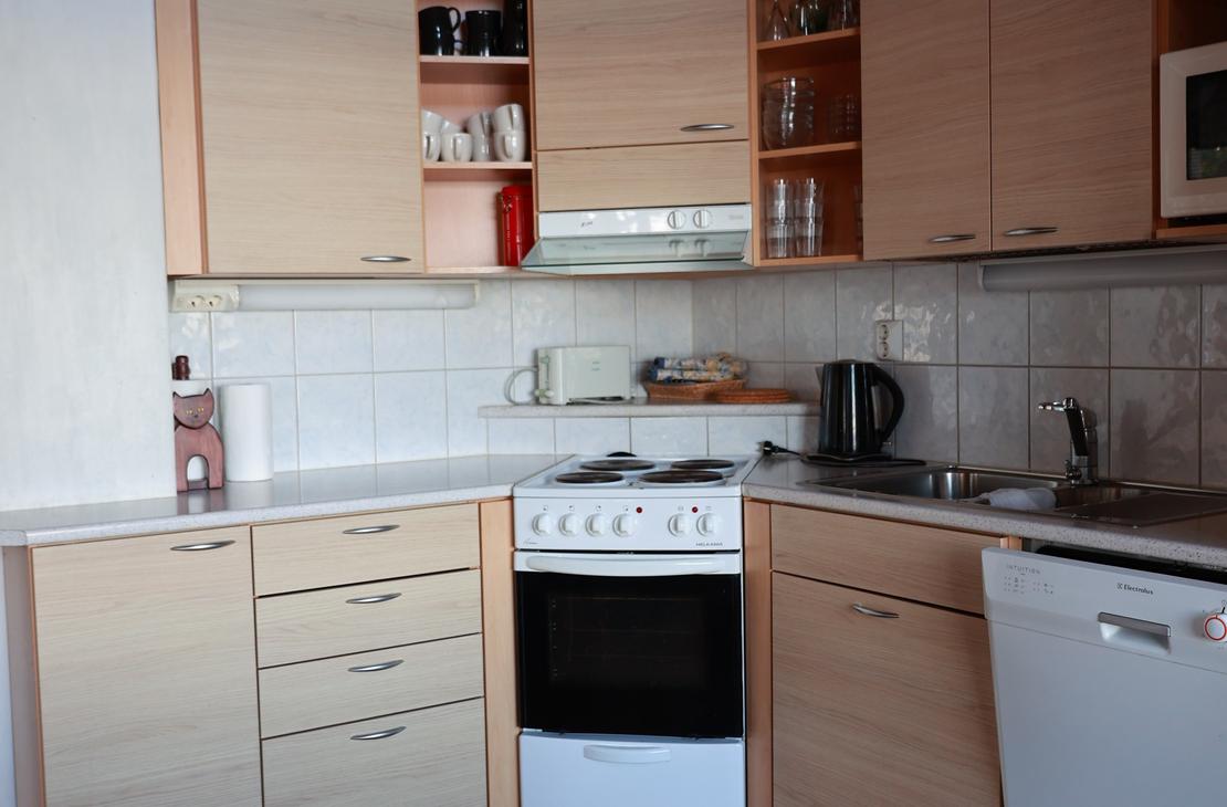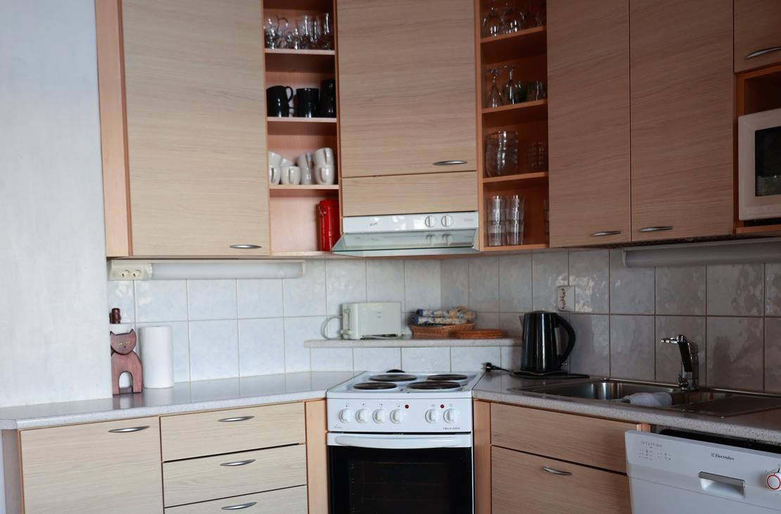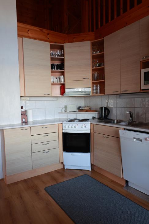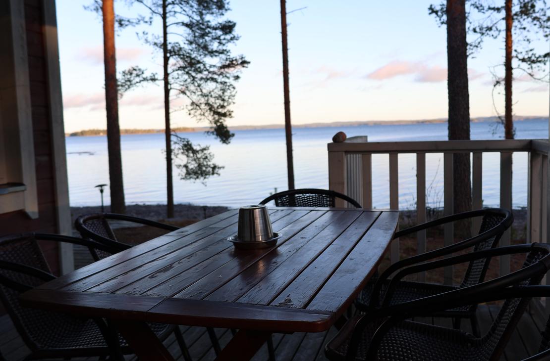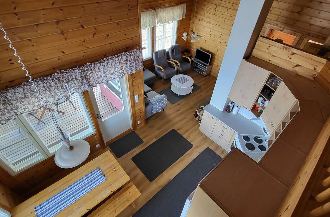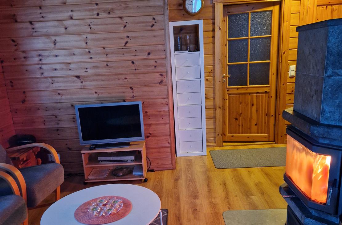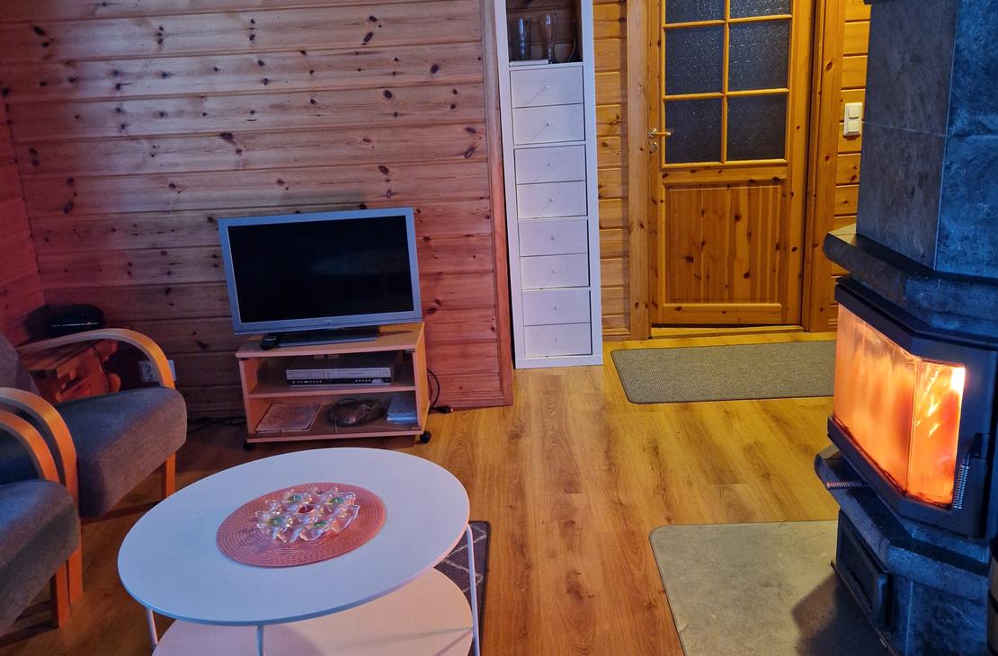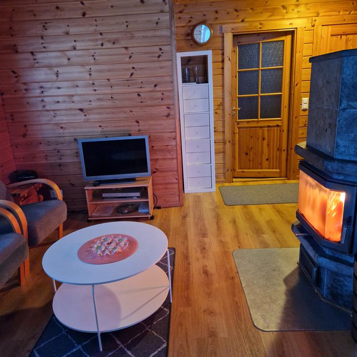 Olohuoneessa varaavatakka antamassa ihanasti tunnelmaa rentouttavaan lomanviettoon. Nykyaikaisessa keittiössä valmistat maistuvat ruuat ja voit nauttia aterioidessasi isosta ikkunasta avautuvaa järvimaisemaa.